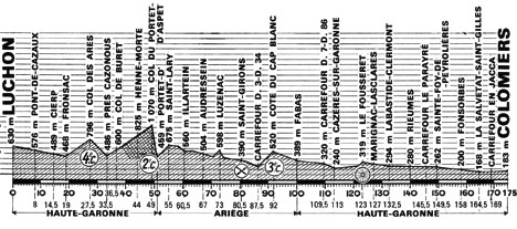 (Haute-Garonne) : Luchon (km 0) - N125 Moustajon (km 2) - Antignac (km 3) - Pont de Cazaux (km 8) - Cierp (km 14.5) - Pont de Chaum (km 17) - N 618 Fronsac (km 19) - Col des Ares (km 27.5-GPM4) - Juzet-d'Izaut (km 36.5) - Col de Buret (km 37.5) - Henne-Morte (km 44) - Col du Portet-d'Aspet (km 49-GPM2) - Portet-d'Aspet (km 51) - (Ariège) : St-Lary (km 65) - Augirein (près de) (km 56.5) - Orgibet (km 58.5) - Illartein (km 60.5) - Aucazein (km 61.5) - Argein (km 63.5) - Audressein (km 67) - Engomer (km 70.5) - Luzenac (km 73) - Moulis (près de) (km 74.5) - St-Girons (km 80.5-ravitaillement) - D3 St-Lizier (km 82.5) - Taurignan-Vieux - Côte du Cap-Blanc (km 92-GPM3) - Tourtouse - Fabas (km 100) - (Haute-Garonne) : Couladère (km 112) - Cazères-sur-Garonne (km 113) - Benque (km 121.5) - Le Fousseret (km 123-sprint) - D7 Marignac-Lasclarès (km 127) - Labastide-Clermont (km 132.5) - Rieumes (km 140) - Ste-Foy-de-Peyrolières (km 149.5) - N632 St-Lys (km 153) - Fonsorbes (km 158) - D82 Les Bordettes (km 162.5) - La Salvetat-St-Gilles (km 164.5) - Colomiers / 1er passage (km 172) - Colomiers / 2ème passage (km 173.5) - Colomiers / Bd. Eugène Montel (km 175).