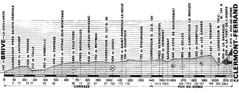 8h40 (Corrèze) : Brive-la-Gaillarde (km 0) - Malemort (km 1) - Sainte-Féréole (près de) - Laborde (km 13) - Lachamp (km 15) - Foissac (km 23) - Tulle (km 27) - Vimbelle (km 89) - Bar (près de) (km 42) - Corrèze (km 48) - Vitrac-sur-Montane (km 55.5) - Egletons (km 66-sprint) - Soudeilles (près de) (km 73) - Le Gourgeat - Laplau-Maussac (km 81) - Meymac (km 87) - Roumignac (près de) - Ussel (km 103-ravitaillement) - Saint-Pardoux-le-Neuf (km 112) - Courteix (km 116) - Couffy-sur-Sarsonne (km 118) - Eygurande (km 130) - (Puy-de-Dôme) : Veneughéol (près de) (km 147.5) - Le Malcornet - Herment (km 150.5) - Sauvagnat (km 155) - Côte de Sauvagnat (km 160-GPM4) - Pérol - La Narse (km 166) - Gelles (km 169-sprint) - Carr. La Miouze (km 175.5) - Mazaye (km 180) - Champille (km 182) - Côte des Gardes (km 187-GPM4) - Ternant (km 196) - Durtol (km 202) - La Baraque (km 208.5) - La Font-de-l'Arbre (km 210.5) - Puy de Dôme (km 216.5-GPM1).