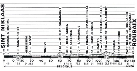 ![]() ![]() ![]() 132 partants. Météo : soleil et forte chaleur. Vent de côté en fin de parcours. A l'arrivée sur le vélodrome de Roubaix, les coureurs auront à parcourir la distance de 200 mètres + 2 tours complets de 500 mètres. Les temps sont pris au poste de chronométrage, placé 200 m avant l'entrée du vélodrome. - La première bagarre a lieu sur le point-chaud de St-Gillis au km 16, chaudement disputé et remporté par Demeyer devant Teirlinck et Riotte. Puis c'est le calme plat jusqu'au Mur de Grammont car les Bic d'Ocana et les Watney de Verbeeck musèlent la course. Dans la rude montée, le peloton s'étire mais reste entier. Verbeeck passe en tête au sommet de cette première côte du Tour 66. Dans la descente Guimard se retrouve seul mais il est vite revu. Au km 95, une chute assez grave se produit et met à terre Guimard, Gonzalez Linares, Genet, Teirlinck, Wright, et surtout Nassen et Prinsen les plus touchés, qui seront hors-délais à Roubaix. - Au km 107, Tino Tabak démarre. De Geest se lance à sa poursuite et fait la jonction mais refuse de relayer (équipier du maillot jaune). L'écart monte à 30" tandis que derrière Berland échoue dans un contre. Dans la bosse du Mont St-Aubert (km 190), De Geest passe en tête devant le Hollandais, le peloton passe 1' plus tard. - L'écart est monté à 1'35" à 20 km du but, De Geest ayant accepté de relayer. Mais le peloton embraye et revient sur les fuyards : 55" aux 14 km, 25" aux 10 km. Ils sont avalés à 6 km de la ligne. Michel Périn contre dès la jonction et s'assure 150 mètres qu'il conservera jusqu'à la flamme rouge. A son tour Verstraeten démarre et prend 100 mètres. Derrière cinq hommes se détachent à la poursuite du Belge : Vianen, Mendes, Rouxel, Delépine et Périn. Verstraeten entre sur le vélodrome de Roubaix avec 70 mètres d'avance. Les coureurs ont à y parcourir la distance jusqu'à la ligne plus 2 tours complets soit 1200 m ce qui fait que Verstraeten se retrouve freiné par la queue du peloton entré plus tard. Il conserve néanmoins son avance et l'emporte sur Vianen qui a réglé Mendes (lequel avait déjà sprinté un tour trop tôt). Le moins que l'on puisse dire c'est que ce fut une certaine confusion comme souvent dans ce genre d'arrivée sur vélodrome ! Van Springel conserve son maillot jaune. ![]() Étape : ![]() 1. Eddy Verstraeten (Bel) en 3h34'49" (moy : 38.544 km/h) 2. Gerard Vianen (Hol) à 7" 3. Fernando Mendes (Por) 4. Michel Périn (Fra) 5. Charly Rouxel (Fra) 6. Régis Delépine (Fra) 7. Walter Godefroot (Bel) à 24" 8. Jacques Mourioux (Fra) 9. Cyrille Guimard (Fra) 10. Jan Krekels (Hol) 11. Jacques Esclassan (Fra) 12. Marc Demeyer (Bel) 13. Frans Verbeeck (Bel) 14. Daniel Ducreux (Fra) 15. Barry Hoban (Gbr) 16. Willy De Geest (Bel) 17. Gustaaf Van Roosbroeck (Bel) 18. Raymond Riotte (Fra) 19. Jean-Pierre Danguillaume (Fra) 20. Walter Planckaert (Bel) 21. Jacques Hochart (Fra) 22. Gilbert Bellone (Fra) 23. Alf Gaida (All) 24. Mariano Martinez (Fra) 25. Joaquim Agostinho (Por) 26. Ludo Van Staeyen (Bel) 27. Gérard Besnard (Fra) 28. Robert Mintkiewicz (Fra) 29. Willy Teirlinck (Bel) 30. Jean-Pierre Genet (Fra) 31. Jacques Botherel (Fra) 32. Jose Luis Viejo (Esp) 33. Yves Hézard (Fra) 34. Gérard Moneyron (Fra) 35. José Martins (Por) 36. Jurgen Tschan (All) 37. Régis Ovion (Fra) 38. Albert Van Vlierberghe (Bel) 39. Jesus Manzaneque (Esp) 40. Ronald De Witte (Bel) 41. Michel Pollentier (Bel) 42. José Catieau (Fra) 43. Agustin Tamames (Esp) 44. Andres Gandarias (Esp) 45. Joël Millard (Fra) 46. Willy Abbeloos (Bel) 47. Raymond Martin (Fra) 48. Jean-Claude Largeau (Fra) 49. Raymond Poulidor (Fra) 50. Damaso Torres (Esp) 51. Johny Schleck (Lux) 52. Ferdinand Julien (Fra) 53. Sylvain Vasseur (Fra) 54. Jose Gomez Lucas (Esp) 55. Paul Aerts (Bel) 56. Marcel Boishardy (Fra) 57. Ludo Noels (Bel) 58. Richard Podesta (Fra) 59. Alain Santy (Fra) 60. Lucien De Brauwere (Bel) 61. Jean-Claude Blocher (Fra) 62. Jose Manuel Fuente (Esp) 63. Ludo Delcroix (Bel) 64. Charly Grosskost (Fra) 65. Englebert Opdebeeck (Bel) 66. Pierre Martelozzo (Fra) 67. Guy Santy (Fra) 68. Wim Kelleners (Hol) 69. Bernard Labourdette (Fra) 70. René Grelin (Fra) 71. Michel Roques (Fra) 72. Tino Tabak (Hol) 73. Claude Tollet (Fra) 74. Lucien Van Impe (Bel) 75. Willy Vanneste (Bel) 76. Wilfried David (Bel) 77. Jean-Jacques Sanquer (Fra) 78. Robert Bouloux (Fra) 79. André Mollet (Fra) 80. Bernard Thévenet (Fra) 81. Jean-Claude Genty (Fra) 82. Leif Mortensen (Dan) 83. Luis Ocana (Esp) 84 Roland Berland (Fra) 85. André Doyen (Bel) 86. Wilfried Peffgen (All) 87. Georges Pintens (Bel) 88. Herman Van Springel (Bel) 89. Alain Nogues (Fra) 90. Joop Zoetemelk (Hol) 91. Mat De Koning (Hol) 92. Ben Janbroers (Hol) 93. Lucien Aimar (Fra) 94. Gonzalo Aja (Esp) 95. Francisco Galdos (Esp) 96. Vicente Lopez Carril (Esp) 97. Luis Balague (Esp) 98. Pedro Torres (Esp) 99. Juan Zurano (Esp) 100. Ronny Van Marcke (Bel) à 1'43" 101. Francis Campaner (Fra) 102. Theo Van der Leeuw (Hol) 103. Carlos Melero (Esp) 104. Jo Vrancken (Hol) 105. Roger Gilson (Lux) 106. Jesus Esperanza (Esp) 107. Felix Gonzalez (Esp) 108. Mathieu Pustjens (Hol) 109. Raymond Delisle (Fra) 110. Jose Grande (Esp) 111. Antonio Martos (Esp) 112. Luis Zubero (Esp) 113. Jose Luis Abilleira (Esp) 114. Santiago Lazcano (Esp) 115. Michel Coulon (Bel) 116. Jose Antonio Gonzalez Linares (Esp) 117. Émile Bodart (Bel) 118. Jean-Pierre Parenteau (Fra) 119. Noël Geneste (Fra) 120. Christian Blain (Fra) 121. Antoon Houbrechts (Bel) 122. Gustaaf Van Cauter (Bel) 123. Michael Wright (Gbr) 124. Jean-Claude Baud (Fra) 125. Antonio Menendez (Esp) 126. Joseph Carletti (Fra) à 8'48" 127. Charles Genthon (Fra) m.t 128. Joaquim Andrade (Por) à 8'35" 129. Herculano Oliveira (Por) m.t 130. Wim Schepers (Hol) à 12'58" Bonifications : 15" Verstraeten, 10" Vianen, 5" Mendes Hors-délais : Pieter Nassen (Bel) (à 20'20") Wim Prinsen (Hol) (à 36'13") Prix de la combativité