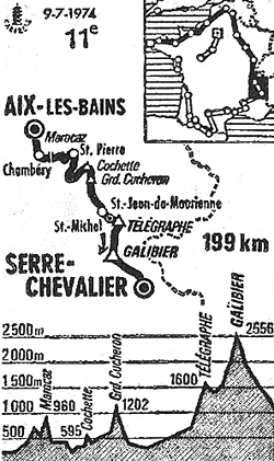 - S'ensuivent les pemières pentes du col du Télégraphe, prélude à celui du Galibier. Menendez porte une attaque et prend 10" d'avance alors que le peloton perd la moitié de ses effectifs dont Thévenet qui abandonne dans la foulée. Devant, les Molteni (Bruyère et Deschonmaecker) assurent un train soutenu et l'Espagnol est repris. A 6 kilomètres du col, il ne reste qu'une vingtaine de coureurs dans le groupe de tête : Merckx, Bruyère, Lopez Carril, Aja, Agostinho, Poulidor, Santy, Van Springel, Galdos, Danguillaume, Catieau, Zubero, Van Impe, Janssens, Romero, Pingeon, Delisle, Labourdette, Panizza & Martinez. Peu après la mi-col, Van Impe, Janssens et Delisle décrochent. A 2 km du sommet, c'est au tour de Catieau, Labourdette et Danguillaume. 13 coureurs se présentent au sommet (km 149.5) et c'est Van Springel qui franchit en tête la banderole suivi d'Aja et Merckx.
