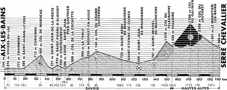 9h55 (Savoie) : Aix-les-Bains/Av. de Marlioz (km 0) - N491 Viviers-du-Lac (km 3.5) - Chambéry (km 13.5) - D8 Saint-Alban-Lesse (km 18.5) - D11 Curienne - Col de Marocaz (km 34-GPM4) - Cruet (km 41) - D201 Saint-Jean-de-la-Porte - Saint-Pierre d'Aubigny (km 49.5-sprint) - D202 Châteauneuf (km 52.5) - D204 Coisne Saint-Jean Pied-Gauthier (km 56.5) - D33 Villard d'Héry (km 80.5) - Col de la Cochette (km 63-GPM3) - La Trinité - D24 La Table (km 72.5) - D24 Bourge-en-Huile (km 78) - Le Pontet - D207 Col du Grand-Cucheron (km 85-GPM3) - D74 Saint-Rémy-de-Maurienne (km 108.5) - Saint-Étienne-de-Cuines (km 115) - Pont de La Madeleine (km 118) - N6 Saint-Jean-de-Maurienne (km 124) - Saint-Michel de Maurienne (km 138-sprint) - N202 Col du Télégraphe (km 149.5-GPM2) - Valloire (km 154.5) - (Hautes-Alpes) : Col du Galibier (km 171.5-GPM1-S.H.D) - Col du Lautaret (km 179) - N91 Le Monetier-les-Bains (km 192.5) - Serre-Chevalier/Aérodrome (km 199).
