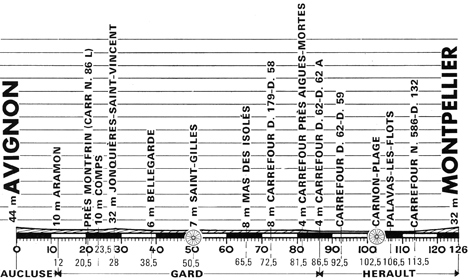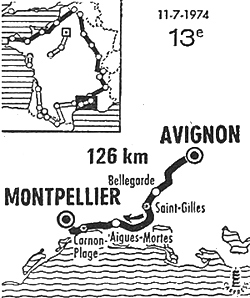 10h00 (Vaucluse) : Avignon/Allées d'Oulle - CD2 (km 0) - (Gard) : Aramon (km 12) - Montfrin (près de) (km 20.5) - Faubourg-du-Pont - N86 Comps (km 23.5) - D102 Jonquières-St-Vincent (km 28) - D163 Bellegarde (km 38.5) - D38 Saint-Gilles (km 50.5-sprint) - D179 Mas des Iscles (km 65.5) - D58 (km 72.5) - Tour-Carbonnière (près de) (km 80.5) - N579 Carr. près d'Aigues-Mortes (km 81.5) - D62 (km 86.5) - (Hérault) : La Grande-Motte (près de) - D59 Carnon-Plage (km 102.5-sprint) - D21E Palavas-les-Flots (km 106.5) - Lattes (près de) (km 113.5) - Montpellier/La Paillade (km 126).