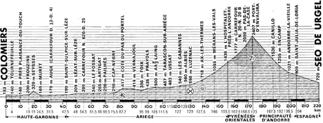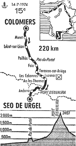 - Dans la descente, le peloton passe en Andorre puis en Espagne. Derrière les leaders se forme un groupe de chasse avec Bruyère, Pesarrodona, Labourdette, Périn, Janssens, Romero, Oliva & Van Neste. Ils comptent 1'20" de retard aux 30 km. A 20 bornes de Seo de Urgel, l'écart est tombé à 45" mais va remonter suite à une attaque de Zurano et Galdos. A 800 mètres de la ligne, Van Springel, Lasa et Zurano tombent. Poulidor évite de justesse la chute. Le maillot jaune part en force et s'impose de 30 mètres devant Martinez et Pollentier. Le 2ème paquet termine à 1'34", le groupe "Pingeon" à 5'13".