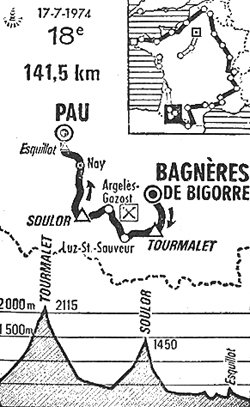 - Van Neste attaque dès le départ mais sans succès. Le peloton monte alors le Tourmalet au train quand Van Impe en décide autrement et démarre. Il est bientôt épaulé par Bellini et Menendez mais Deschoemaecker ramène le peloton... lequel explose sur une accélaration de Santy 2 kilomètres plus loin. Le Français est rejoint par Delisle, Aja, Merckx, Poulidor & Lopez Carril. Derrière, Agostinho emmène un important groupe de chasse. Panizza, Oliva & Deschoenmaecker sont intercalés. Peu avant La Mongie, à 6 km du col, Lopez Carril perd le contact et il est repris par Panizza, Oliva, Pollentier, Zurano et Van Schil. Aux 3 km, Aja démarre et se dégage. Delisle, Merckx & Poulidor sont à 10", Santy à 40", le groupe Panizza, Lopez Carril à 1'. Alors que les poursuivants reviennent sur lui, Aja redémarre. Au sommet du Tourmalet (km 27.5), l'Espagnol passe en tête avec 30" sur Poulidor, Merckx et Delisle, 55" sur Pollentier et Santy, 1'15" sur un premier groupe mené par Perurena, Lopez Carril, Ovion, Zurano etc.