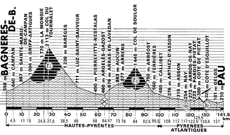 11h45 (Hautes-Pyrénées) : Bagnères-de-Bigorre/rte des cols (km 0) - N135 Beaudéan (près de) (km 3.5) - Campan (km 4.5) - Sainte-Marie de Campan (km 11) - N618 Gripp-Artigues (km 15) - La Mongie (km 24.5) - Col du Tourmalet (km 27.5-GPM1) - Barèges (km 38.5) - Luz-Saint-Sauveur (km 46) - N21 Soulom - Pierrefitte-Nestalas (km 58) - Argelès-Gazost (km 64-ravitaillement) - N618 Arras-en-Lavedan (km 67) - Aucun (km 73) - Marsous (km 74) - Arrens (km 76) - Col du Soulor (km 84-GPM1) - N126 Arbéost (km 92.5) - Ferrières (km 95.5) - Callibet - (Pyrénées-Atlantiques) : Arthez-d'Asson (km 106) - Asson (km 112) - D36 Nay (km 117-sprint) - D37 Bourdette (km 119.5) - Arros-de-Nay (km 120) - Saint-Abit - D24 Pardiès-Piétat (km 122.5) - D285 Côte d'Esquillot (km 130.5-GPM3) - D37 Gelos (km 137) - N134 Pau/circuit automobile (km 141.5).
