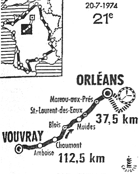 - Van Clooster part au sprint. Il est rejoint par Catieau puis Riotte. A peine repris, ce dernier repart au km 8 avec Delcroix, Menendez et Alain Vasseur... en vain. Vers Amboise (km 17), Sibille attaque en compagnie de Janssens & Pesarrodona. Les 3 hommes finissent par s'entendre et roulent. Au km 25, ils possèdent 25" d'avance mais les Molteni et les Brooklyn ramènent le peloton au km 36, peu après Chaumont-sur-Loire.