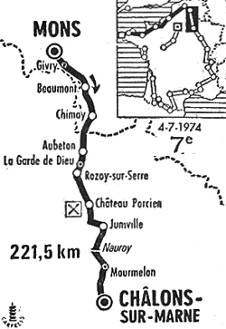- Au milieu des champs de blé et de betteraves, le peloton musarde encore pendant 2 heures. Il faut la côte de Nauray (km 174) pour animer un peu les débats. Perurena l'emporte devant les habituels Oliva et Abilleira. Nouveau repos jusqu'au dernier point-chaud de Mourmelon. Gualazzini emmène le sprint pour Sercu qui s'impose devant Karstens, lequel redevient virtuel maillot jaune !