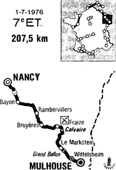 10h56 (Meurthe-et-Moselle) : Nancy - Jarville (km 0) - N4 Laneuveville (km 2) - D 112 Ville-Vermois (km 7.5) - Ferrières (km 15) - Saint-Mard (km 21.5) - Lorey - Bayon (km 25) - D22 Rozelieures (km 35) - Mattexey (km 42) - Magnières (km 46) - (Vosges) : D414 Saint-Pierremont (km 47) - Roville-aux-Chênes (km 53.5) - Rambervillers (km 59) - Sainte-Hélène (km 65.5) - Grandvillers (km 72) - Buyères (km 78) - D423 Yvoux (km 81) - Vieuville - Corcieux (km 92.5) - Col du Plafond (km 96) - D8 Anould (km 101) - D415 Fraize (km 104.5-ravitaillement) - Plainfaing (km 106.5) - Col du Bonhomme (km 115) - D48II Col du Luschpach (km 118) - Col du Calvaire (km 121-GPM3) - Col de la Schlucht (km 136) - (Haut-Rhin) : N430 Col de Harrenberg (km 149) - Col d'Hahnenbrunnen (km 153.5) - Le Markstein (km 158) - N431 Le Grand Ballon (km 165-GPM4) - Col Amié (km 171) - Col de Silberloch (km 176) - Col de Herrenfluh (km 178) - Uffholtz (km 186) - Cernay (km 188) - D2bis Wittelsheim (km 194.5-sprint) - Richwiller - Pfastatt (km 201.5) - Mulhouse / Pl. du 14 juillet (km 207.5).