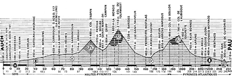 9h40 (Gers) : N21 Auch / Pl. de la Libération - N21 Carr. D929 (km 0) - D929 Pavie (km 2) - D929 Carr. D161 (km 5.5) - Orbessan (km 10-sprint) - Ornezan (km 13.5) - Seissan (km 16-sprint) - D2929 Carr. D304 (km 18) - Masseube (km 22) - Panassac (km 27) - Chelan (km 31.5) - (Hautes-Pyrénées) : Castelnau-Magnoac (km 38) - Claret - D292 Carr. D28 (km 43) - Moulong (km 48.5) - D292 Carr. D117 La Demi-Lune (km 60) - La Berthe-de-Neste (km 66) - D929 Hèches (km 72.5) - Sarrancolin (km 80-ravitaillement) - Arreau (km 87) - N618 Col d'Aspin (km 100-GPM2) - Espladet (km 105) - Payolle (km 106.5) - Pradille (km 109) - La Séoule (km 110) - Sainte-Marie-de-Campan (km 113) - Gripp (km 117) - Col du Tourmalet (km 130-GPM1-S.H.D.) - Barèges (km 141) - Luz-Saint-Sauveur (km 148) - N21 Pierrefitte-Nestalas (km 160) - N618 Argelès-Gazost (km 166-ravitaillement) - Arras-en-Lavedan (km 169) - Aucun (km 175) - Arrens-Marsous (km 178) - Col du Soulor (km 186) - (Pyrénées-Atlantiques) : Col d'Aubisque (km 196-GPM1) - Gourette (km 200) - Eaux-Bonnes (km 208) - Laruns (km 214) - N134b Bielle (km 221.5) - Louvie-Juzon (km 225) - Sévignacq-Meyracq (km 228.5) - Rébenacq (km 235) - Gan (km 243) - D234 Côte de Guindalas (km 246-GPM4) - Gelos (km 248.5) - Pau / Circuit automobile (km 253).