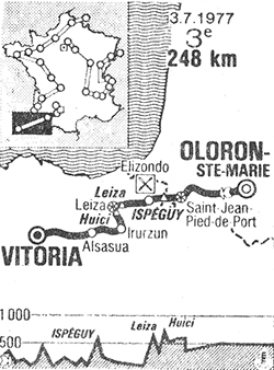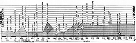 - Les Espagnols sont désireux de se montrer pour entrer chez eux et Ocana donne le ton au km 7 mais Bertin, Esparza et Delcroix ramènent le meute. Gandarias s'y met puis Lopez Carril au km 17, km 20 et km 22 et encore Nazabal flanqué de Bourreau et Berland. Toutes les tentatives sont éteintes dans l'oeuf. 31 kilomètres sont parcourus dans la 1ère heure. Après le col non classé d'Osquich (km 42.5), le peloton débute l'ascension du col d'Ispéguy. Ce sont Thurau et les Ti-Raleigh qui impriment le tempo. Van Impe démarre peu avant le sommet et soigne son classement de la montagne devant Torres et Kuiper le porteur du maillot à pois. Ce trio possède alors 18" sur les favoris menés par Martins.