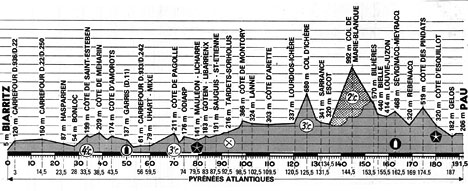 - C'est un peloton groupé qui escalade la côte de Saint-Esteben, km 33. J.J. Fussien passe en tête légèrement détaché. Toujours en rangs serrés, le peloton aborde la 2ème difficulté, la côte de Pagolle (km 70). Menendez emmène devant mais Le Lay parvient à le déborder et franchir le sommet en tête. Van Impe et quelques leaders passent 12" plus tard alors que Vandenbroucke et Thévenet sont déjà en difficulté.