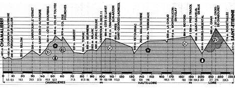 - C'est sous un beau soleil que les coureurs attaquent la côte de Dourbias au sommet de laquelle Pollentier devance Martinez et Muselet. Le peloton toujours groupé se présente ensuite au col de Toutée (km 8.5) pour le 1er point chaud, où Villemiane l'emporte. Dans le petit col des Fourches, Pollentier se dégage en vue du sommet et passe en tête la banderole. Le peloton progresse ensuite à bonne allure jusqu'à Lavet (km 59) où J.F. Pescheux accroche Gauthier et chute lourdement : fracture du coude, il est évacué vers l'hôpital du Puy. Le 2ème rush (km 59) est encore gagné par Villemiane devant Laurens et peu après, Loos se retrouve lui aussi au sol : fracture du métatarse gauche et abandon.