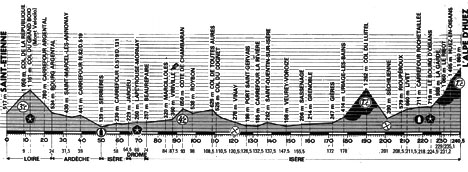 (Loire) : 9h00 Saint-Étienne - Bellevue (km 0) - Col de la République (km 9-GPM3) - Col du Grand Bois (km 12.5-sprint) - Bourg Argental (km 24.5) - (Ardèche) : St-Marcel-lès-Annonay (km 31.5) - Boulieu - Peaugres (km 43) - Serrières (km 50) - (Isère) : Sablons - Chanas - Les Falques - Bougé-Chambalud (km 60.5) - Jarcieu (km 64.5) - (Drôme) : Lapeyrouse-Mornay (km 69-sprint) - (Isère) : Beaurepaire (km 74) - St-Barthélémy - Marcilloles (km 84) - Viriville (km 87.5) - Côte de Chambaran (km 93-GPM4) - Roybon (km 98) - Col de Toutes-Aures (km 108.5) - Col du Cognet (km 110.5) - Nerpol et Serres (km 113.5) - Charpenay (km 116) - Vinay (km 120.5-ravitaillement) - Port-Saint-Gervais (km 126.5) - St-Quentin-sur-lsère (km 137.5) - Veurey-Voroize (km 147.5) - Sassenage (km 155.5) - Point de Catane (km 159.5) - Gières (km 172) - Uriage-les-Bains (km 178) - Col du Luitel (km 190-GPM1) - Séchilienne (km 201-ravitaillement) - Gavet - Les Glavaux - Rioupéroux (km 208.5) - Livet (km 211.5) - Le Bourg-d'Oisans (km 224.5-sprint) - La Garde (km 229) - Le Ribat (km 231.2) - Huez-en-Oisans (km 235.1) - L'Alpe-d'Huez / Av. du Rif-Nel (km 240.5-GPM1).