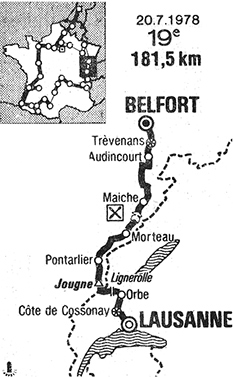 - De petites velléités d'attaque d'entrée pour en arriver au rush de la côte de Cossonay (km 8.5) où Villemiane passe en tête. Au sommet de la côte de Lignerole (km 30.5) escaladée par un peloton groupé, Villemiane encore précède Fussien et Martinez. Après la descente, le Tour rentre en France où Hinault franchit en tête la côte de Jougne (km 43) devant Martinez. Hinault revient ainsi à deux points au classement de la montagne. On ne bouge guère dans le peloton hormis quelques petites attaques de Fussien, de Coccolo et de Plet, vite réprimées. Après avoir parcouru 60 km à vive allure, la cadence baisse d'autant que quelques gouttes font leur apparition. Le peloton reste groupé jusqu'au ravitaillement de Maiche (km 120.5) où le soleil revient. Fussien tente une sortie à Noirfontaine (km 139) bientôt épaulé par quelques coureurs dont Le Guilloux, Bittinger et Teirlinck mais l'écart ne dépassera pas 10" et le peloton est à nouveau compact au km 145.