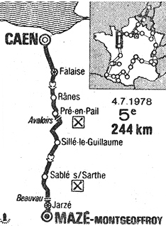 - Tout le début d'étape est calme à travers le Calvados, l'Orne et la Mayenne. Quelques petites côtes ne déclenchent pas la bagarre et on ne peut relever que les "rush" et les "grimpeurs" pour animer un peu le peloton : Falaise (km 38) : gagné par Fussien, puis la côte des Avaloirs (km 98) : Le Lay devant Legeay, rush de Sillé-le-Guillaume (km 143) : remporté par Bossis et dans la foulée, 3 coureurs tentent une sortie : Nilsson, Menendez & Friou. Ils sont vite rejoints.