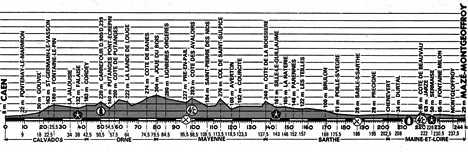 9h52 (Calvados) : Caen (km 0) - Fontenay-le-Marmion (km 9) - Caillouet (km 13) - Breteville-sur-Laize - Gouvix (km 18) - Urville (km 19.5) - St-Germain-le-Vasson (km 22.5) - Fontaine (km 23.5) - Fontaine-le-Pin (km 25.5) - Villers-Canivet (km 30.5) - La Jalousie (km 34) - Falaise (km 38-sprint) - St-Pierre-du-Bû (km 40) - Cordey (km 42.5) - (Orne) : Bazoches-au-Houlme (km 47.5) - Putanges (km 54.5) - Côte de Putanges (km 57.5) - La Lande Le Langé (km 64) - Rânes (km 72) - Côte de Rânes (km 74.5) - Joué-du-Bois (km 79.5) - (Mayenne) : Lignières-Orgères (km 84.5) - Saint-Samson (km 92) - Pré-en-Pail (km 95.5-ravitaillement) - Côte des Avaloirs (km 98.5-GPM4) - Saint-Pierre-des-Nids (km 106.5) - Gesvres (km 111.5) - Co! de Saint-Sulpice (km 113.5) - Averton (km 119.5) - Courcité (km 123.5) - La Boissière (km 135) - Côte de la Boissière (km 137.5) - (Sarthe) : Sillé-le-Guillaume (km 143-sprint) - La Raterie (km 148) - Parennes (km 152) - Les Teilles (km 157) - Brulon (km 169) - Poillé-sur-Vègre (km 175.5) - Sablé-sur-Sarthe (km 186-ravitaillement) - Précigné (km 195) - Chenevert (km 202.5) - (Maine-et-Loire) : Durtal (km 208) - Beauvau (km 218.5) - Côte de Beauvau (km 220-GPM4) - Jarzé (km 222-sprint) - Sermaise (km 26) - Fontaine-Milon (km 230.5) - Montgeoffroy (km 237) - Mazé (km 238.5) - Mazé-Montgeoffroy (km 244).