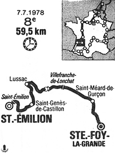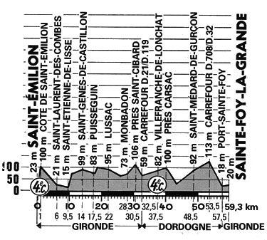 9h53 (Gironde) : Saint-Émilion (km 0) - Côte de St-Émilion (km 9-GPM4) - St-Christophe des Bardes (km 3.5) - St-Laurent-des-Combes (km 6) - St-Hippolyte (près de) (km 6.5) - Saint-Étienne-de-Lisse (km 9.5) - Saint-Genès-de-Castillon (km 14) - Puisseuin (km 17.5) - Roques (près de) (km 20) - Lussac (km 22) - Monbadon (km 28) - St-Cibard (près de) (km 30.5) - (Dordogne) : Villefranche-du-Longchamp (km 37.5-GPM4) - Carsac (près de) (km 40) - St-Médard-de-Gurcon (km 48.5) - Fougueyrolles (km 53.5) - Port-Sainte-Foy (km 57.5) - (Gironde) : Sainte-Foy-la-Grande / Bd. Paul Bert (km 59.3).