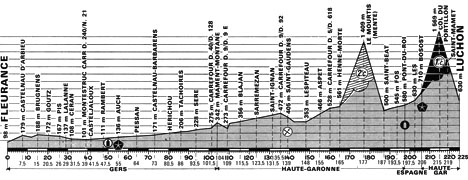 10h40 (Gers) : Fleurance (km 0) - Castelnau-d'Arbieu (km 7.5) - Carr. près d'Urdens (km 12) - Brugnens (km 15) - Goutz (km 20.5) - Aygues-Mortes - Taybosc (km 24) - Pis (km 26) - Lalanne (km 29) - Céran (km 31.5) - Montestruc (km 39) - CasteIjaloux (km 41.5) - Rambert (km 47.5) - Auch (km 55-sprint) - Pessan (km 64) - Castelnau-Barbarens (km 73) - Hérichou (km 80.5) - Tachoires (km 86) - Moncorneil - Les 4-Routes (km 92.5) - Sere (km 93.5) - Manent-Montane (km 104) - (Haute-Garonne) : Boulogne-sur-Gesse (km 111) - Blajan (km 115.5) - Sarremezan (km 123.5) - Lodes (près de) (km 129) - Saint-Ignan (km 131.5) - Saint-Gaudens (km 139-ravitaillement) - Miramont-de-Comminges (km 142) - Lespiteau (km 148) - Soueich (km 151) - Aspet (km 155) - Sengouagnet (km 159) - Henne-Morte (km 165) - Couledoux (km 169) - Le Mourtis (Menté) (km 177-GPM2) - Boutx - Saint-Béat (km 187) - Arlos (km 190) - Fos (km 193.5) - Sériail / poste frontière (km 195) - Pont-du-Roi / douane espagnole (km 197.5) - (ESPAGNE) - Pontaut (km 199.5) - Les (km 202.5) - Bosost (km 205.5-sprint) - Douane espagnole (km 206) - (FRANCE) - (Haute-Garonne) : Col du Portillon (km 215-GPM1) - Douane française (km 218) - Saint-Mamet (km 219) - Luchon (km 225).