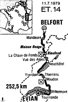 - Au km 167, Hinault, bien emmené par Bernaudeau, gagne le "rush" de Thierrens et prend à nouveau 10" de bonification devant Villemiane... et Zoetemelk. Quelques coureurs dont Laurent et Wellens sont lâchés mais reviendront dans le peloton juste avant le ravitaillement de Moudon (km 174.5). Le 4ème des 5 "rushes" se déroule à Villeneuve (km 216.5) et là encore Bernard Hinault l'emporte devant Zoetemelk. Les secondes grapillées s'accumulent. Après quoi Knetemann tente un démarrage qui s'avère vain avant que Berto se détache et prenne 15" d'avance puis 26" au km 233. Martens, Didier, Duclos-Lassalle se lancent un instant en contre-attaque mais le peloton les reprend puis c'est le tour de Berto avant le franchissement de la frontière franco-suisse (km 233.5).