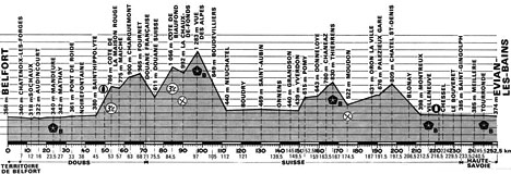 9h20 (Territoire de Belfort) : Belfort / Bd Danjoutin (km 0) - Sevenans (km 3.5) - Trévenans (km 5) - Châtenois-les-Forges (km 7) - (Doubs) : Sochaux (km 12) - Exincourt (km 13.5) - Audincourt (km 16) - Valentigney - Mandeure (km 23.5-sprint) - Mathay (km 27) - Bourguignon (près de) (km 29) - Le Fourneau (km 31.5) - Pont de Roide (km 33) - Noirefontaine (km 38) - Saint-Hippolyte (km 45) - Côte de la Maison Rouge (km 53-GPM3) - Maiche (km 57) - Le Frélot (km 60) - Charquemont (km 63) - Fournet (km 68) - Douane française (km 71) - (SUISSE) - Douane Suisse (km 75.5) - Côte de Biaufond (km 84.5-GPM3) - La Chaux-de-Fonds (km 90-GPM3) - Vue des Alpes (km 97) - Les Hauts-Geneveys (km 101) - Malvilliers (km 103) - Boudevilliers (km 105) - Neuchâtel (km112) - Boudry (km 121) - Saint-Aubin (km 130) - Vaumarcus (km 132) - Concise (km 137) - Omnens (km 139.5) - Grandson (km 145) - Les Tuileries (km 146) - Yverdon (km 149.5) - Pomy (km 152.5) - Donneloye (km 159) - Prahins (km 162) - Chanéaz (km 163.5) - Thierrens (km 167) - Moudon (km 174.5-sprint) - Montet (km 178.5) - Rue (km 181.5) - Promasens - Oron-la-Ville (km 187) - Palezieux (km 189.5) - Palezieux-Gare (km 191.5) - Bossonnens (près de) (km 193.5) - Châtel Saint-Denis (km 197.5) - Blonay (km 206.5) - Montreux (km 212.5) - Villeneuve (km 216.5-sprint) - Noville (km 220.5) - Chessel (km 224) - Porte du Sex (km 224.5) - Port-Valais - Le Bouveret (km 229.5) - Saint-Gingolph / frontière (km 233.5) - (FRANCE) - (Haute-Savoie) : Bret (km 236) - Locum (km 238) - Meillerie (km 240.5) - Tourronde (km 245.5-sprint) - Maxilly Petite Rive (km 247.5) - Grand-Rive (km 248.5) - Évian-les-Bains / Av. du Gal. Dupas (km 252.5).