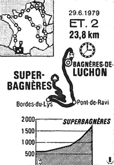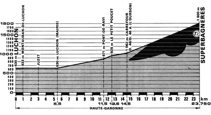10h22 (Haute-Garonne) : Luchon / Bd. Edmond Rostand (km 0) - Av. de Montauban (km 1) - Juzet (km 3) - Luchon Mairie (km 5.5) - Pont de Ravi (km 11.5) - Le Petit Poucet (km 12.5) - Carr. L'Ourson (km 14.5) - Superbagnères (km 23.870-GPM1).