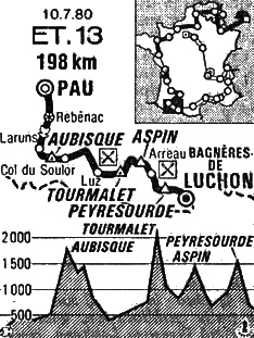 Le groupe mené par Zoetemelk se rapproche à 1'30" dans l'Aspin. Mais l'entente ne règne pas et Martin reprend le large avec 3'35" d'avance. Au km 154.5, il franchit le col avec 3'20" sur Belda, Loos, Zoetemelk, Kuiper, Bernaudeau, Alban, Wilmann, Agostinho, De Muynck. Au bas de la descente, Martin a encore 3' d'avance puis 3'10" à l'abordage de Peyresourde. Régis Ovion revient alors dans le groupe Zoetemelk à 15 km du sommet du col.