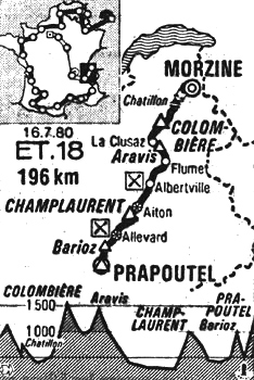 Loos poursuit sa route seul. Au "rush" d'Allevard (km 168) Wilmann, victime d'une crevaison, passe à 1'56", Thévenet à 8'46", avec Laurens. Le peloton est à 9'20".
