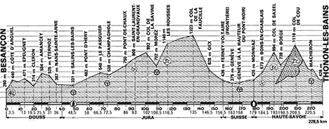 9h46 (Doubs) : Besançon - Beurre (km 0) - Côte d'Arguel (km 3.5-GPM4) - D473 Pugey (km 5) - Épeugney (km 13) - Cléron (km 19.5) - Fertans (km 23) - Amancey (km 25.5) - D103e Éternoz (km 31) - D492 Nans-Sainte-Anne (km 36) - (Jura) : D492 Carr. D273 (km 44) - Salins-les-Bains (km 48.5-sprint) - D472 Carr. D467 (km 50.5) - D467 Moutaine (km 53.5) - Pont d'Héry (km 58) - D467 Carr. D107 (km 58.5) - D467 Vers-en-Montagne (km 64.5) - Le Pasquier (km 66.5) - D467 Carr. N5 (km 69) - N5 Champagnole (km 72.5-sprint) - Pont-de-Chaux (km 86) - Pont-de-Lemme (km 92) - Saint-Laurent-en-Grandvaux (km 93-ravitaillement) - Col de la Savine (km 102) - Morbier (km 105.5) - Morez (km 108.5-sprint) - Les Rousses (km 116.5-GPM3) - (Ain) : N5 Carr. N936 (km 132) - Col de la Faucille (km 135) - Gex (km 146.5) - Segny (km 150.5) - Maconnex (km 152.5) - Ornex (km 154.5) - Ferney-Voltaire / frontière (km 156.5) - (SUISSE) - N47 Grand Saconnex (km 161) - Genève (km 163) - Genève / Pont Noir (km 168-sprint) - Vesenas (km 169) - La Paillanterie - Compois - Sionnet (km 174) - N39 Jussy (km 175) - Monniaz (km 179) - (FRANCE) - (Haute-Savoie) : D216 - D903 Saint-Cergues (km 180.5) - D903 Carr. N203a (km 181) - Langin (km 182.5) - Bons-en-Chablais (km 184.5-ravitaillement) - D20 Col de Saxel (km 193-GPM3) - Boëge (km 198.5) - D22 Villard (km 202.5) - Harbère-Lullin (km 205) - Harbère-Poche (km 205.5) - Col de Cou (km 209.5-GPM2) - Maugry (km 218) - Macheron (km 220.5-sprint) - Noyer (km 222) - D233 Allinges (km 223) - D203 Carr. D303 (km 225) - Morcy (km 226) - Thonon-les-Bains / Av. du Général de Gaulle (km 228.5).