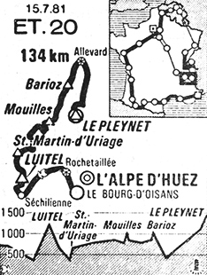 - Le rush d'Allevard (km 108.5) est gagné par Bernaudeau, les écarts étant de 1'03" et 2'51". Les coureurs abordent alors l'ultime ascension longue de 22 kilomètres menant au Pleynet-les-Sept-Laux. Bernaudeau change de vélo (pour la 3ème fois) et il est rejoint par Hinault et De Wolf. A 18 km du sommet, les "trois" reviennent sur Juan Fernandez alors que l'avant-garde du peloton est à 2'42". L'Espagnol est décramponné à 16 km du sommet, le peloton est à 2'14" puis l'écart va se stabiliser aux alentours de 2'30". Dans la partie la plus raide, à 3000 mètres de l'arrivée, le maillot jaune part irrésistiblement et va creuser l'écart jusqu'à la ligne d'arrivée. Bernard Hinault remporte l'étape avec panache et marque les esprits. Bernaudeau termine à 32" et De Wolf à 1'26". L'excellent Marcel Tinazzi règle le petit groupe des favoris. Il faut aussi noter l'abandon d'Agostinho, 3ème en 78 et 79, 5ème en 1980.