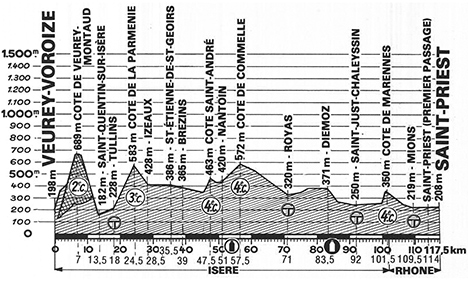 13h29 (Isère) : Veurey-Voroize (km 0) - D3 Côte de Veurey-Montaud (km 7-GPM2) - D218 Saint-Quentin-sur-Isère (km 13.5) - Tullins (km 18-sprint) - Côte de la Parménie (km 24.5-GPM3) - D73e Izeaux (km 28.5) - D73e Carr. D519 (km 29.5) - D519 Sillans (km 31.5) - Saint-Étienne-de-Saint-Geoirs (km 35.5) - D518 Brézins (km 39) - La Côte-Saint-André (km 45) - D71 Côte Saint-André (km 47.5-GPM4) - D71 Carr. D51e (km 50) - D51e Nantoin (km 51) - D51 Commelle (km 54) - Côte de Commelle (km 57.5-GPM4) - D56 Saint-Christophe (km 61) - D502 Chatonnay (km 62.5) - Saint-Jean-de-Bournay (km 68) - D502 Carr. D518 (km 69) - D518 Royas (km 71-sprint) - Beauvoir-de-Marc (km 74) - Diemoz (km 83.5) - D518 Carr. D36 (km 84.5) - D36 Carr. Lafayette (km 86.5) - Saint-Just-Chaleyssin (km 92-sprint) - D36 Luzinay (km 95.5) - Vilette-de-Vienne (km 99) - Côte de Marennes (km 101.5-GPM4) - D150 Chaponnay (km 105) - D152 Carr. D149 (km 108.5) - D151 Mions (km 109.5-sprint) - D148 Saint-Priest / 1er passage (km 114) - Saint-Priest / Bd. Herriot (km 117.5).