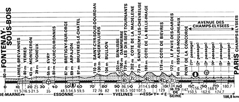 11h50 (Val-de-Marne) : Fontenay-sous-Bois - D30 Bry-sur-Marne (km 0) - Champigny-sur-Marne (km 2.5) - Saint-Maur-des-Fossés (km 4.5) - Bonneuil-sur-Marne (km 8.5) - Limeil-Brévannes (km 11.5) - (Essonne) : D94 Yerres (km 16.5) - D32 Crosnes (km 19.5) - N5b Montgeron (km 21.5) - N448 Vigneux (km 25) - Draveil (km 27) - Soisy-sur-Seine (km 31.5) - D93 Évry (km 35-sprint) - D153 Courcouronnes (km 40) - Bondoufle (km 43) - D19 Brétigny-sur-Orge (km 48.5) - Arpajon (km 54.5) - D152 Ollainville (km 56) - Bruyères-le-Châtel (km 59.5) - D116 Carr. D27 (km 61) - D27 Carr. D3 (km 64) - Le Marais - Le Val-Saint-Germain (km 70) - Saint-Cyr-sous-Dourdan (km 72) - D838 Angervilliers (km 76) - (Yvelines) : D132 Bonnelles (km 80) - Bullion (km 82) - D149 Carr. D24 (km 88.5) - Senlisse (km 91) - D149 Carr. D91 (km 91.5) - D91 Dampierre (km 93.5) - Les 17 Tournants (km 95.5-GPM4) - Saint-Laurent (km 96.5) - D13 Chevreuse (km 100.5) - Côte de la Madeleine (km 102-GPM3) - N306 Saint-Rémy-lès-Chevreuse (km 107.5) - Carr. de Courcelle (km 110) - (Essonne) : Côte de la Belle-Image (km 114.5-GPM4) - Le Christ de Saclay (km 116.5) - N446 Carr. Villeras (km 119) - (Yvelines) : N446 Carr. D117 (km 120.5) - (Essonne) : D117 Carr. D53 (km 123.5) - D53 Bièvres (km 124.5) - Côte de Bièvres (km 126-GPM4) - (Yvelines) : Vélizy (km 130) - Vélizy-le-Bas (km 131.5) - (Hauts-de-Seine) : D181 Chaville (km 133.5) - Le Pavé des Gardes (km 134-GPM3) - Meudon (km 136) - Issy-les-Moulineaux (km 139.5) - (Paris) : N189 Quai André Citroën (km 142) - Pont de la Concorde (km 147) - Av. des Champs-Élysées / 1er passage (km 150.5) - 2ème passage (km 156.5) - 3ème passage (km 162.6-sprint) - 4ème passage (km 168.6) - 5ème passage (km 174.7) - 6ème passage (km 180.7) - Paris / Champs-Élysées (km 186.8).