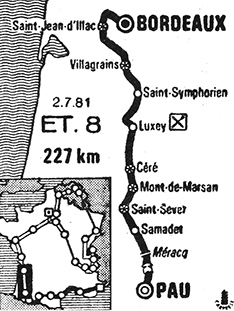 - Les Redoute attaquent ensuite à plusieurs reprises : Van den Haute puis Bazzo et encore Alban (km 39) mais le peloton reste intransigeant. Freddy Maertens gagne le 1er rush de St-Sever (km 59) devant Verlinden et Tackaert, le 2ème à Mont-de-Marsan (km