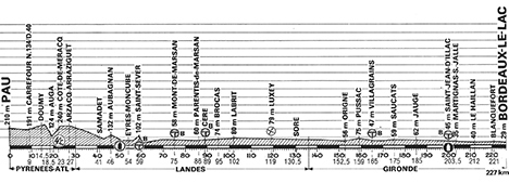 10h12 (Pyrénées-Atlantiques) : Pau (km 0) - N134 Carr. D40 (km 9) - D40 Doumy (km 14.5) - Auga (km 18.5) - D40 Carr. D944 (km 22) - D944 Côte de Méracq (km 23-GPM4) - Arzac-Arraziguet (km 27) - (Landes) : Péchevin (km 32) - Samadet (km 41) - Aubagnan (km 46) - Coudures (km 49) - Eyres-Moncube (km 54) - D933 Saint-Sever (km 59-sprint) - Carr. Haut Mauco (km 67.5) - Mont-de-Marsan (km 75-sprint) - N134 Carr. D651 (km 80) - D651 Parentis-de-Marsan (km 86) - Céré (km 89-sprint) - Brocas (km 95) - Labrit (km 102) - Luxey (km 119) - Sore (km 130.5) - D8 Saint-Symphorien (km 144.5) - D11 Carr. D116E (km 148) - D110 Origne (km 152.5) - D110 Louchats (près de) (km 158) - D115 Pussac (km 159) - Villagrains (km 165-sprint) - D651 Saucats (km 175) - D16 Jauge (km 185) - Pierroton / Gare (km 191.5) - Saint-Jean d'Illac (km 200-sprint) - D107 Martignas-sur-Jalle (km 203.5) - Saint-Médard-en-Jalles (km 207.5) - Magudas (km 208) - Le Haillan (km 212) - D109E Eysines (km 214.5) - Bruges (km 218) - D108 Blanquefort (km 221) - Bordeaux / Le Lac (km 227).