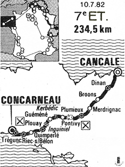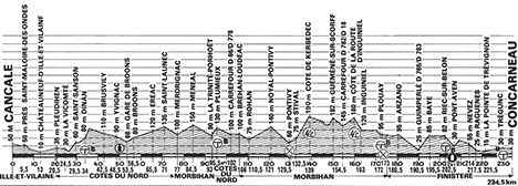 9h50 (Ile-et-Vilaine) : D76 Cancale (km 0) - St-Maloire-des-Ondes (près de) (km 5.5) - La Gouesnière (près de) (km 9) - Chateauneuf d'Ile-et-Vilaine (km 13) - (Côtes-du-Nord) : D74 - D29 Pleudihen (km 20.5) - La Vicomté (km 24.5) - D57 La Hisse (km 26.5) - Saint-Sanson (km 29.5) - D766 Dinan (km 34-sprint) - D793 Brusvilly (km 42.5) - Yvignac (km 48.5) - Broons (km 56.5) - Eréac (km 66.5) - Saint-Launeuc (km 71) - Merdrignac (km 77) - (Morbihan) : Ménéac (km 84.5) - La Trinté-Porhoët (km 93) - (Côtes-du-Nord) : D66 Plumieux (km 95.5-sprint) - (Morbihan) : D2 Bréhan-Loudéac (km 106) - D2 Rohan (km 110.5) - Noyal-Pontivy (km 121) - Pontivy (km 129.5-ravitaillement) - D764 Stival (km 132.5) - Côte de Kerbédic (km 139-GPM4) - D782 Guéméné-sur-Scorff (km 150) - D18 Côte de la route de d'Inguiniel (km 160-GPM4) - Inguiniel (km 163) - D2 Plouay (km 173-sprint) - Pont Kerlo - (Finistère) : Arzano (km 180.5) - D765 Quimperlé (km 190.5) - D783 Baye (km 195.5) - Riec-sur-Belon (km 202.5-sprint) - Pont-Aven (km 207) - Croissant Kergos (km 209) - D77 Nevez (km 214) - Raguenes (km 217.5) - D1 La Pointe-de-Trévignon (km 221.5) - Trégunc (km 230-sprint) - D783 Concarneau (km 234.5).