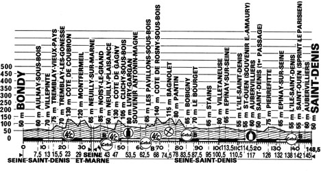 12h45 (Seine-Saint-Denis) : Bondy (km 0) - Le Blanc-Mesnil (km 1.5) - Drancy (km 4) - Le Blanc-Mesnil (km 6) - Aulnay-sous-Bois (km 7.5) - Villepinte (km 13) - Tremblay-Vieux Pays (km 15.5) - Tremblay-les-Gonesse (km 20) - Vaujours (km 21.5) - Côte Coubron (km 23-GPM4) - Clichy-sous-Bois (km 24.5) - Coubron (km 25) - Montfermeil (km 29) - Gagny (km 32) - Neuilly-sur-Marne (km 34.5) - Gournay-sur-Marne (km 35) - (Seine-et-Marne) : Chelles (km 35.5) - (Seine-Saint-Denis) : Gournay-sur-Marne (km 36) - Noisy-le-Grand (km 39.5) - Neuilly-sur-Marne (km 14.5) - Neullly-Plaisance (km 43-sprint) - Neuilly-sur-Marne (km 44) - Côte de Gagny (km 48-GPM4) - Montfermeil (km 48.5) - Clichy-sous-Bois (km 50) - Livry-Gargan (km 53.5) - Sevran (km 55.5 ) - Aulnay-sous-Bois (km 59) - Les Pavillons-sous-Bois (km 62.5-sprint) - Le Raincy (km 63.5) - Villemomble (km 65) - Côte de Rosny-sous-Bois (km 68-GPM4) - Montreuil (km 70) - Bagnolet (km 74.5-ravitaillement) - Les Lilas (km 76) - Le Pré-Saint-Gervais (km 77) - Pantin (km 78) - Romainville (km 80) - Noisy-le-Sec (km 82) - Bobigny (km 83.5-sprint) - Drancy (km 86) - Le Bourget (km 87.5) - La Courneuve (km 90) - Dugny (km 92) - Stains / entrée circuit (km 95) - Pierrefitte (km 98) - Villetaneuse (km 100.5) - Épinay-sur-Seine (km 104) - L'Ile-Saint-Denis (km 110.5) - Saint-Ouen (km 113.5) - Saint-Denis (km 114.5) - Aubervilliers (km 117) - Saint-Denis / 1er passage (km 120) - Stains (km 123) - Pierrefitte (km 126) - Villetaneuse (km 128.5) - Épinay-sur-Seine (km 132) - L'Ile Saint-Denis (km 138-sprint) - Saint-Ouen (km 141.5) - Saint-Denis (km 142) - Aubervilliers (km 145) - Saint-Denis / r. Gabriel Péri (km 148.5).