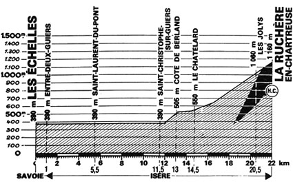11h10 (Savoie) : Les Échelles (km 0) - (Isère) : Entre-Deux-Guiers (km 1) - Saint-Laurent-du-Pont (km 5.5) - Saint-Christophe-sur-Guiers (km 11.5) - Côte de Berland (km 13) - Le Combet (km 13.5) - Le Chatelard (km 14.5) - Les Reverdys (km 20) - Le Grand Village - Les Jolys (km 20.5) - Les Chartreux - La Ruchère en Chartreuse (km 22-GPM HC).