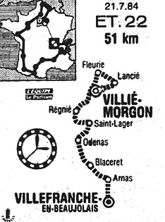 11h17 (Rhône) : Villié-Morgon (km 0) - Lancié (km 3) - Fleurie (km 5.5) - La Chapelle-des-Bois (km 6.5) - Chiroubles (km 11.5) - Villié-Morgon (km 15.5) - Régnié (près de) (km 20) - Cercié (km 23.5) - Saint-Lager (km 24.5) - Odenas (km 28) - Le Perreon (km 33.5) - Vaux-en-Beaujolais (km 34.5) - Blaceret (km 41.5) - Arnas (km 45.5) - Villefranche-en-Beaujolais (km 51).