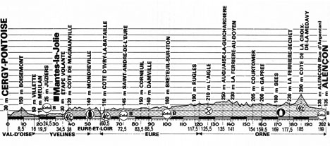 11h00 (Val d'Oise) : Cergy-Pontoise (km 0) - Jouy-le-Moutier (km 3) - Boisemont (km 8) - Menucourt (km 10) - Sagy-Saillencourt (km 12) - Villette (km 16) - (Yvelines) : Tessancourt (km 18) - Meulan (km 19) - Hardicourt (km 20) - Mézy (km 22) - Juziers (km 24-sprint) - Gargenville (km 27) - Issou (km 28) - Limay (km 33) - Mantes-la-Jolie (km 34-E.V) - Mantes-la-Ville (km 36) - Côte de Magnanville (km 38-GPM4) - Soindres (km 40) - Favrieux (km 43) - Longnes (km 47) - Mondreville (km 51) - (Eure-et-Loir) : Le Mesnil-Simon (km 52) - Les Gâtines Rouges (km 55) - La Chaussée d'Ivry (km 57) - (Eure) : Côte d'Ivry-la-Bataille (km 60-GPM4) - La Couture-Boussey (km 63) - Mousseaux-Neuville (km 68) - St-André de l'Eure (km 72-sprint) - Les Authieux (km 76) - Corneuil (km 83) - Damville (km 88) - Authenay (km 90) - Gouville (km 95) - Le Chesnay (km 98) - Breteuil-sur-Iton (km 100-sprint) - Bemecourt (km 104) - Rugles (km 117) - (Orne) : Saint-Martin d'Ecublei (km 120) - Saint Sulpice-sur-Risle (km 123) - L'Aigle (km 125-ravitaillement) - Auguaise-la-Guichardiére (km 135) - La Ferrière-au-Doyen (km 141) - Moulins-la-Marche (km 143) - Courtomer (km 154) - Gaprée (km 159) - Sées (km 169) - La Ferrière-Bechet (km 177) - Côte de la Croix de Medavy (km 185-GPM4) - Alençon / route d'Argentan (km 199-sprint) - Alençon / Bd. Koutiala (km 202).