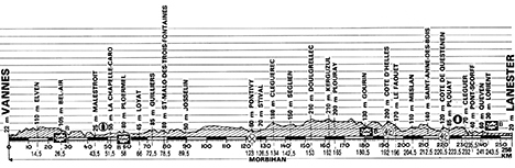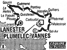 9h45 (Morbihan) : Vannes (km 0) - Elven (km 14.5) - D1 Carr. D775 (km 20) - D775 Bel-Air (km 26.5-sprint) - D5 Carr. D776 (km 38.5) - Malestroit (km 43.5) - D764 Carr. N166 (km 51) - N166 La Chapelle-Caro (km 61.5) - Plöermel (km 58-sprint) - D766 Carr. D13 (km 64) - D13 Loyat (km 66) - Guilliers (km 72.5) - D16 Saint-Malo des Trois-Fontaines (km 76.5) - D16 Carr. D793 (km 86.5) - D793 Carr. N24 (km 87.5) - Josselin (km 89.5) - D778 Carr. D764 (km 90.5) - D764 Carr. N24 (km 91) - Pontivy (km 123-ravitaillement) - Stival (km 126.5) - D15 Cléguérec (km 134) - D15 Carr. D18 (km 138.5) - D18 Séglien (km 142.5) - D18 Carr. D1 Guéméné-sur-Scorff (km 148) - D142 Carr. D3 (km 148.5) - D3 Carr. D1 (km 149) - D1 Poulgrellec (km 153) - Toubahado - Kerguzul (km 162) - Plouray (km 165) - Gourin (km 180.5-sprint) - D769 Côte d'Helles (km 192-GPM4) - D769 Carr. D790 (km 195) - D790 Le Faouêt (km 196) -