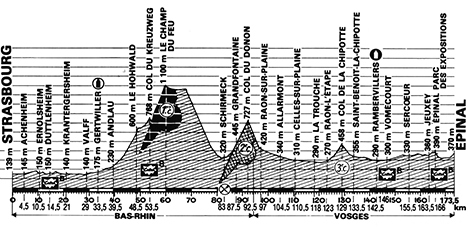 11h40 (Bas-Rhin) : Strasbourg - Eckbolsheim (km 0) - D45 Wolfisheim (km 1.5) - Obershaeffolsheim (km 2.5) - Achenheim (km 4.5) - Breuschwickersheim (km 6) - D45 Carr. D793 (km 9.5) - D793 Ernolsheim (km 10.5) - D793 Carr. D147 (km 11.5) - Duttlenheim (km 14.5-sprint) - Innenheim (km 18.5) - D215 Krautergersheim (km 21) - Meistratzheim (km 24.5) - Valff (km 29) - D206 Carr. D706 (km 29.5) - D706 Bourgheim (km 31) - D706 Carr. N422 (km 32.5) - N422 Gertwiller (km 33.5) - D425 Barr (km 35) - Eichhoffen (km 37.5) - Andlau (km 39.5) - Le Hohwald (km 48.5) - Col du Kreuzweg (km 53.5-sprint) - D425 Carr. D57 (km 54.5) - D57 Col de la Charbonnière (km 58) - D214 Le-Champ-du-Feu (km 60-GPM1) - D214 Carr. D130 (km 65) - D130 Rothau (km 80) - N420 La Broque (km 82) - Schirmeck (km 83-ravitaillement) - D932 Wackenbach (km 86) - Grandfontaine (km 87.5) - Col du Donon (km 92.5-GPM 2) - (Vosges) : Raon-sur-Plaine (km 97) - Luvigny (km 99.5) - Vexaincourt (km 101.5) - Allarmont (km 104.5) - D392a Celles-sur-Plaine (km 110.5) - La Trouche (km 118) - Raon-l'Étape (km 122) - D159bis Col de la Chipotte (km 129-GPM3) - Saint-Benoît-la-Chipotte (km 133.5) - Bru (km 138) - D159bis Carr. D32 (km 140) - D32 Rambervillers (km 142.5) - D46 Vomécourt (km 146-sprint) - Padoux (km 151.5) - Sercoeur (km 155.5) - D46 Jeuxey (km 163.5) - N420 Épinal / Parc des Expositions (km 166-sprint) - Épinal / Place des Vosges (km 168) - Épinal / av. Léon Blum (km 173.5).