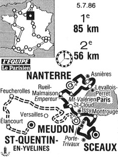 - Une manifestation perturbe le début d'étape mais l'allure du peloton devient ensuite très vive. Bauer remporte le premier sprint "Catch" à Asnières (km 11) devant Vanderaerden et Glaus. Ces sprints apportent 12", 6" et 3" aux trois premiers. A Clichy (km 21.5), le Canadien Alex Stieda démarre seul et compte 47" d'avance au deuxième sprint de Levallois-Perret (km 23). Au km 27 se produit une chute collective à l'arrière du peloton, sans gravité. Un kilomètre plus loin, Pascal Jules part en contre-attaque et au sommet de la côte du Mont-Valérien (km 33.5), il passe à 54" du Canadien, le peloton emmené par Pensec passe à 1'08".