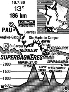 - Finalement, à la sortie de Luchon (km 171), Criquielion, Grewal et Cabrera parviennent à revenir sur la tête, soit 9 coureurs devant pour aborder la montée finale sur Superbagnères. Criquielion attaque et se fait contrer par Herrera, LeMond et Zimmermann. Le maillot jaune est distancé, ainsi que Criquielion. A un peu moins de 10 km de l'arrivée, Hinault est à 1'35" tandis que Millar et Hampsten reviennent sur les trois leaders. Hampsten attaque dès la jonction. LeMond part à sa poursuite et le rejoint. Herrera, Millar et Zimmermann sont distancés à tour de rôle alors qu'Hinault perd beaucoup de terrain : 4'06" à 6 km de l'arrivée où LeMond décramponne Hampsten. Greg LeMond part seul vers la victoire. Dans les derniers kilomètres, Hinault parvient à stabiliser l'écart et sauve son maillot jaune pour 40". Delgado et surtout Bernard ont aussi payé leurs efforts de la veille.