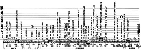 10h14 (Aude) : Carcassonne (km 0) - D820 Villalier (km 6.5) - Villegly (km 11) - D11 Peyriac-Minervoit (km 22.5-sprint) - Rieux-Minervois (km 24.5) - La Redorte (km 31) - Homps (près de) (km 32.5) - (Hérault) : Carr. D11-D53E3 (km 38.5) - Capestang (km 65-sprint) - Montady (km 72) - Béziers (km 80-sprint) - Béziers (km 80.5-ravitaillement) - Lieuran-lès-Béziers (km 90.5) - D15 Espondeilhan (km 93) - Pouzolles (près de) - Roujan (km 103) - D15 Neffiès (km 106.5) - Côte de Neffiès (km 108.5-GPM4) - Cabrières (km 115.5) - D908 Clermont-l'Hérault (km 124.5) - D4 Brignac (km 128.5) - Saint-André-de-Sangonis (km 133) - N109 Cignac (km 136.5) - D32 Aniane (km 141-sprint) - Puechabon (km 146) - Côte de Fontanilles (km 149-GPM4) - Viols-le-Fort (km 155-ravitaillement) - Saint-Martin-de-Londres (km 161-sprint) - D1 Côte du Pic-St-Loup (km 169-GPM4) - Saint-Bauzille-de-Montmel (km 184) - Buzignargues (km 188) - Galargues (km 189.5) - (Gard) : D22 Sommières (km 195.5) - N110 Villevieille (km 197) - D22 Souvignargues (km 200.5) - D522 Montpezat (km 206.5-sprint) - D999 Nîmes / entrée) (km 219) - Nîmes / Av. J. Jaurès (km 225.5).