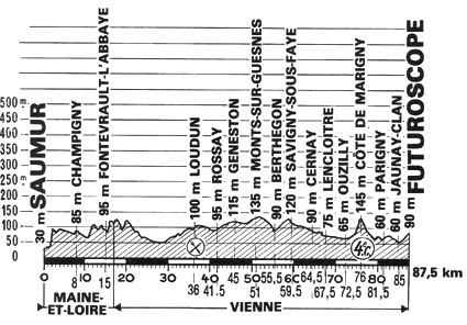 (Maine-et-Loire) : Saumur (km 0) - D145 Côte du Château (km 2.5) - Champigny (km 8) - Fontevraud-I'Abbaye (km 15) - (Vienne) : D147 - Loudun (km 36-ravitaillement) - D14 Rossay (km 41.5) - La Roche-Rigault (km 44.5 ) - Geneton (km 45) - D24 Monts-sur-Guesnes (km 51) - D14 Vayolles (km 54) - Berthegon (km 55.5) - D73 Savigny-sous-Faye (km 59.5) - Cernay (km 64.5) - D20 L'Encloître (km 67.5) - Ouzilly (km 72.5) - Côte de Marigny-Brizay (km 76-GPM4) - Marigny-Brizay (km 77) - Saint-Léger-la-Palu (km 80) - Parigny (km 81.5) - Jaunay-Clan (km 85) - Futuroscope (km 87.5).
