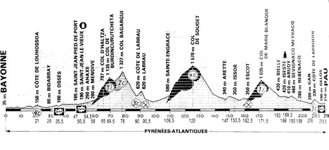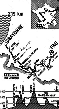 11h00 (Pyrénées-Atlantiques) : Bayonne (km 0) - D932 Ustaritz (près de) - Cambo (près de) - D918 Itxassou (près de) - Côte de Louhossoa (km 21-GPM4) - Louhossoa (près de) - Bidarray (km 29) - Osses (km 35.5-sprint) - Uhart-Cize (km 46) - Saint-Jean-Pied-de-Port (km 47) - D 933 Ispoure (km 48) - Saint-Jean-le-Vieux (km 50.5-sprint) - D18 Ahaxe (km 54.5) - Lecumberry (km 57) - Mendive (km 58) - Col d'Haitza (km 65) - Col de Burdincurutchea (km 69.5-GPM1) - D19 Col Bagargui (km 78-GPM2) - Côte de Larrau (km 90-GPM3) - D26 Larrau (km 90.5-ravitaillement) - D113 lieu-dit Sainte-Engrace Caserne (km 104.5) - Saint-Engrace (km 109.5) - Col de Soudet (km 125-GPM HC) - D132 - lieu-dit La Mouline (km 140) - Arette (km 147) - D918 Issor (km 153.5) - N134 - D238 Escot (km 162.5-ravitaillement) - D294 Col de Marie-Blanque (km 171.5-GPM1) - Bilhères (près de) - Bielle (km 183) - D920 Iseste (km 188) - D53 Arudy (km 189.5) - D934 Sevignacq-Meyracq (km 193) - Rebenacq (km 198) - Gan (km 206) - D285 Côte de Larroude (km 209.5-GPM3) - Gelos (km 216.5-sprint) - N134 Pau / pl. de Verdun (km 219).