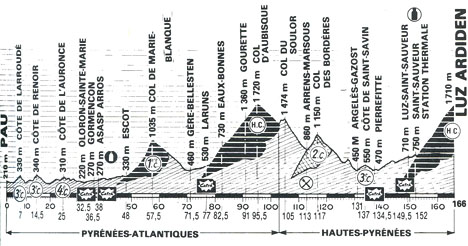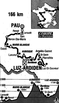10h50 (Pyrénées-Atlantiques) : Pau (km 0) - Gelos - D285 Mazères-Lezons (km 2) - Côte de Laroude (km 7-GPM3) - D24 Gan (km 10) - Côte de Renoir (km 14.5-GPM3) - Lasseube (km 20.5) - Côte de l'Auronce (km 25.5-GPM4) - Goes (km 30) - Oloron-Sainte-Marie (km 32.5) - N134 Bidos (km 34) - Gurmençon (km 36.5-sprint) - Asasp-Arros (km 38-sprint) - D238 Escot (km 48) - D 294 Col de Marie-Blanque (km 57.5-GPM1) - Bilhère (près de) (km 65) - Bielle (km 69) - D934 Gèze-Gellesten (km 71.5) - Laruns (km 77-sprint) - D918 Eaux-Bonnes (km 82.5) - Gourette (km 91) - Col d'Aubisque (km 95.5-GPM HC) - (Hautes-Pyrénées) : D918 Col du Soulor (km 105) - Arrens-Marsous (km 113-ravitaillement) - Col des Bordères (km 117-GPM2) - Estaing (km 119.5) - D103 Arras-en-Lavedan (km 127.5) - D918 Argelès-Gazost (km 131) - D101 Lau Balagnas (km 132) - Saint-Savin (km 134-GPM3) - Pierrefitte (km 137-sprint) - D921 Soulom (km 137.5) - Larise (km 146) - Esquièze-Serre (km 148.5) - Luz-Saint-Sauveur (km 149.5-sprint) - D921 Saint-Sauveur / Station Thermale (km 152) - D12 Sazos (km 155) - Grust / D12-Rte Sivom (km 156.5) - Luz-Ardiden (km 166-GPM HC)