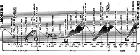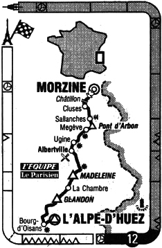 10h00 (Haute-Savoie) : Morzine (km 0) - D902 Les Gets (km 4.5) - Les Perrières (km 6) - Taninges (km 15.5) - Côte de Châtillon-sur-Cluses (km 19.5-GPM4) - Cluses (km 25.5) - N205 Magland (km 32.5) - Oex (près de) - Sallanches (km 40.5) - N212 Combloux (km 48.5) - Côte du Pont-d'Arbon (km 51.5-GPM2) - Megève (km 53.5) - Praz-sur-Arly (km 57.5-sprint) - (Savoie) : Flumet (km 63) - Ugine (km 76.5-sprint) - Albertville (km 84.5-ravitaillement) - Cevins (km 97) - D94 Notre-Dame-de-Briançon (km 103.5) - D97 La Lechère (km 105) - La Léchère / St. thermale (km 107-sprint) - Bellecombe / l'Etrat (km 107.5) - Bellecombe / St-Laurent (km 108.5) - D213 Saint-Oyen (km 110) - Doucy (km 115.5) - Combelouvière (km 118.5) - D94 Celliers (km 124.5) - Celliers-Dessus (km 125.5) - Col de la Madeleine (km 135-GPM1) - D213 Longchamp (km 140) - Montoudras (km 148.5) - Saint-Martin-sur-la-Chambre (km 152.5) - La Chambre-Saint-Avre (km 154.5-ravitaillement - D927 Saint-Etienne-de-Cuines (km 157) - Le Villard Martinan (km 166.5) - Saint-Colomban-des-Villards (km 167) - Col du Glandon (km 177.5-GPM HC) - (Isère) : D526 Le Rivier (km 191) - Allemond (km 201) - Rochetaillèe (km 204.5) - N91 Bourg-d'Oisans (km 211-sprint) - D211 La Garde (km 215.5) - Le Ribot d'Huez (km 218) - Huez-en-Oisans (km 221.5) - L'Alpe d'Huez / av. du Rif (km 227).