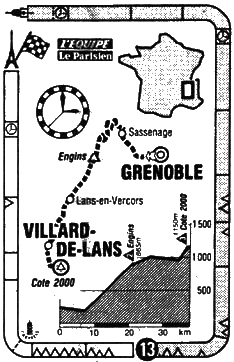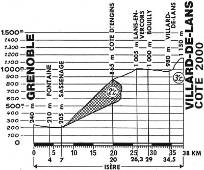 (Isère) : Grenoble (km 0) - N532 Seyssinet (km 2) - Fontaine (km 4) - Sassenage (km 7) - D531 Les Côtes (km 10.5) - Les Brêts (km 18) - Côte d'Engins (km 20-GPM2) - Lans-en-Vercors (km 26.5) - Bouilly (km 29) - Les Geymonds (km 32) - D215A Villard-de-Lans (km 34.5) - D215B Villard-de-Lans / Côte 2000 (km 38-GPM3).