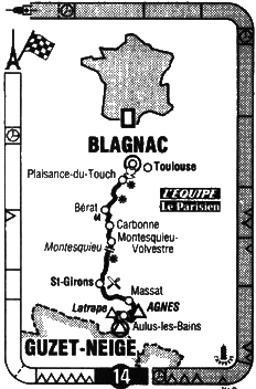 - Planckaert gagne les "catch" du km 6.5. L'allure est vive, tandis que Vermote gagne le spécial "km 44". Les attaques se multiplient et après la côte de Montesquieu, 14 coureurs se dégagent au km 71 : Bouvatier, Gayant, Millar, Bagot, Marie, Vanotti, Vichot, Le Clerc, Sergeant, Clère, Mujika, Stevenhaagen, Ghirotto et Arnaud. L'écart augmente vite : 1'10" au km 76. Les Reynolds conduisent le peloton à train de sénateurs à partir du km 80, où l'écart passe à 1'50", 4' au km 85, 7'15" à Saint-Girons au km 94, 9' au km 108, 11'30" au km 120.