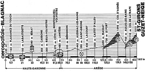 10h55 (Haute-Garonne) : Blagnac / aérospatiale - Saint-Martin-du-Touch (km 0) - D632 Tournefeuille (km 1) - Plaisance du Touch (km 6.5-sprint) - Lamasquere (près de) (km 18) - D3 Labastidette (km 21-sprint) - D23 L'Herm (km 26) - Bérat (km 33) - D627 Carbonre (km 45.5) - Rieux Volvestre (km 51) - Montesquieu Volvestre (km 58) - Côte de Montesquieu Volvestre (km 61.5-GPM4) - Lahitère (km 66.5-sprint) - (Ariège) : D627 Sainte-Croix Volvestre (km 71) - Mérignon (km 76.5) - Montardit (km 79) - Audinac-les-Bains (km 89) - D117 Saint-Girons (km 94-ravitaillement) - D618 Eycheil (km 97.5) - Lacourt (km 100.5) - Castet d'Alleu (km 110.5) - Biert (km 118.5) - Massat (km 121.5) - D18 Le Port (km 125.5) - D8 Col d'Agnès (km 140-GPM1) - Aulus-les-Bains (km 149.5) - Col de Latrape (km 155-GPM2) - Guezt-Neige / plateforme « Prat Mataou » (km 163-GPM1).
